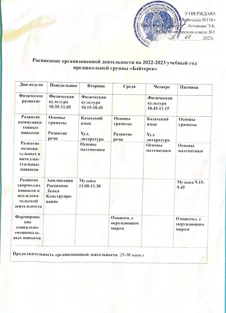 05 қыркүйек 2022 0 1 2 3 4 5 Расписание организованной деятельности предшкольной группы "Бәйтерек" Расписание организованной деятельности детей согласно Типовому учебному плану дошкольного воспитания и обучения для детей дошкольного возраста.