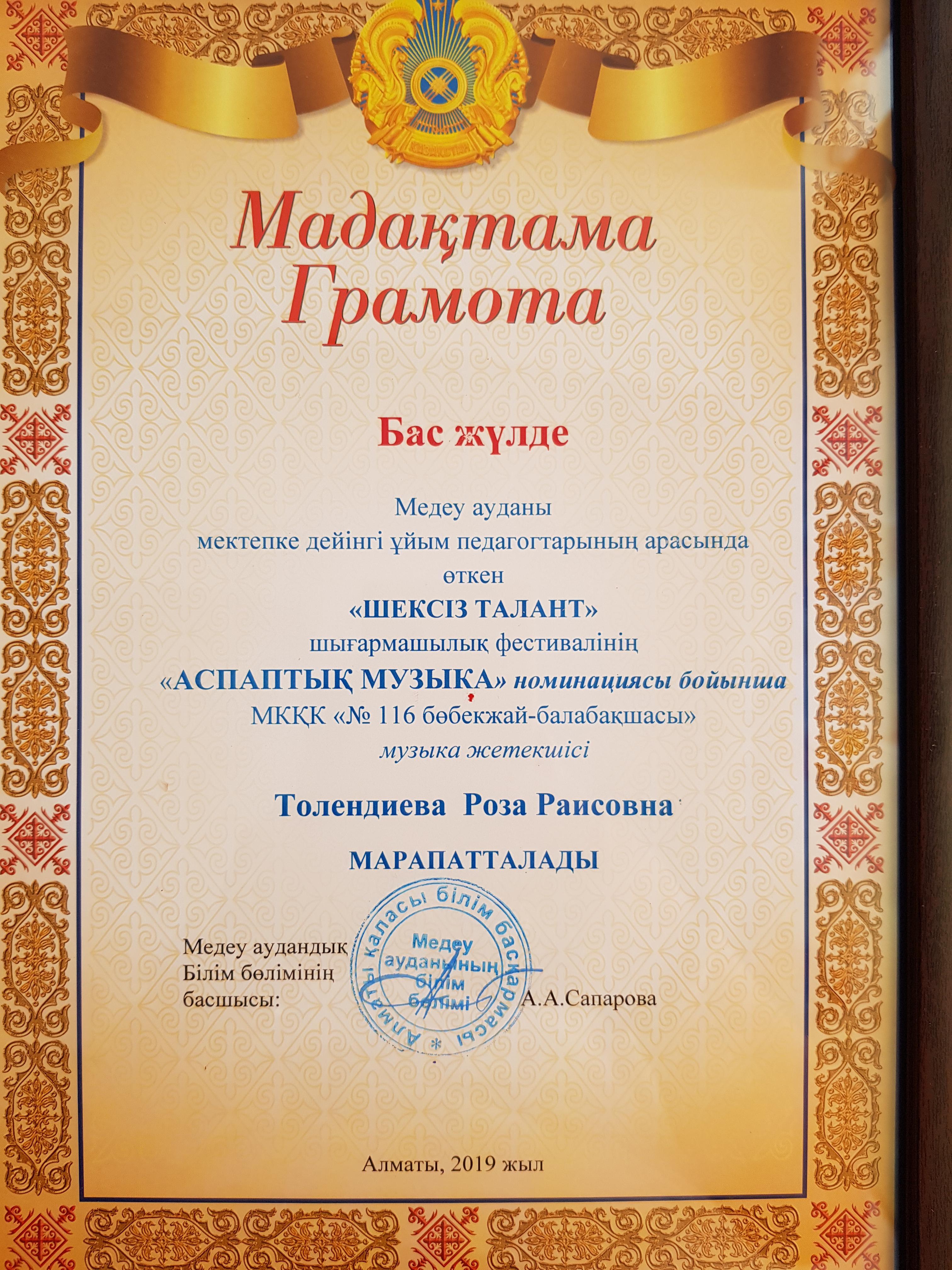 Алматы қаласы мектепке дейінгі ұйым педагогтарының «ШЕКСІЗ ТАЛАНТ» I қалалық шығармашылық фестивалінің, аспаптық музыка номинациясында жеңімпазы Толендиева Роза Раисовна Бас жүлдеге ие болды! МКҚК "№116 бөбекжай-балабақшасының" ән жетекшісі.