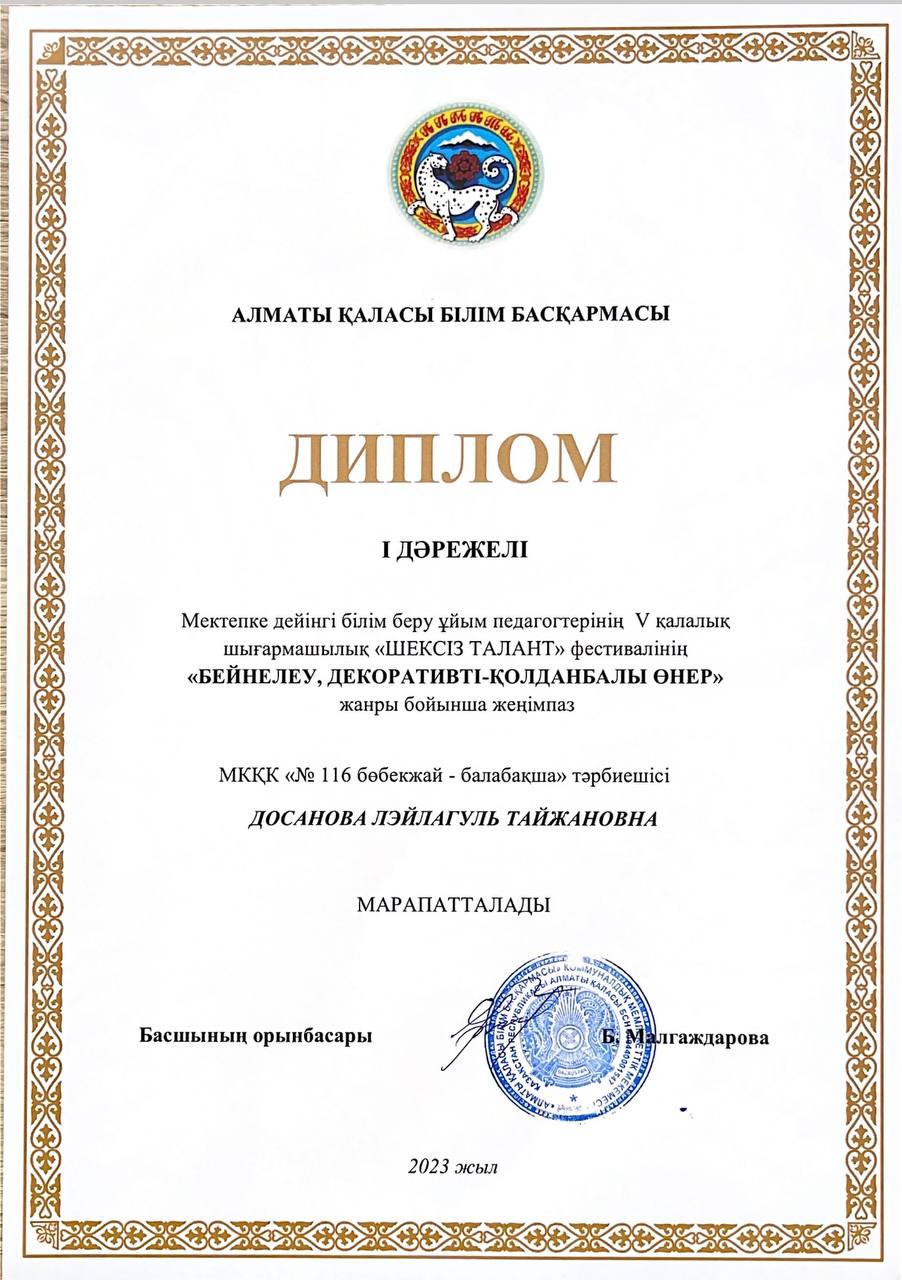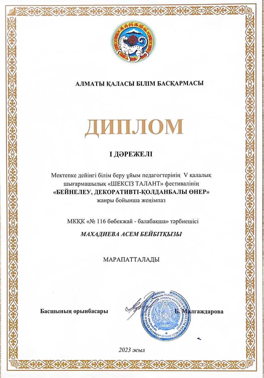 2023ж. - Диплом-1 орын (қалалық кезең) "Бейнелеу, декоративті-қолданбалы өнер" номинациясы бойынша Алматы қаласы Мектепке дейінгі білім беру педагогтерінің "ШЕКСІЗ ТАЛАНТ" V қалалық шығармашылық фестивалінде "№116 бөбекжай-бақшасының " тәрбиешілері Досанова Л.Т., Махадиева А.Б. марапатталды.