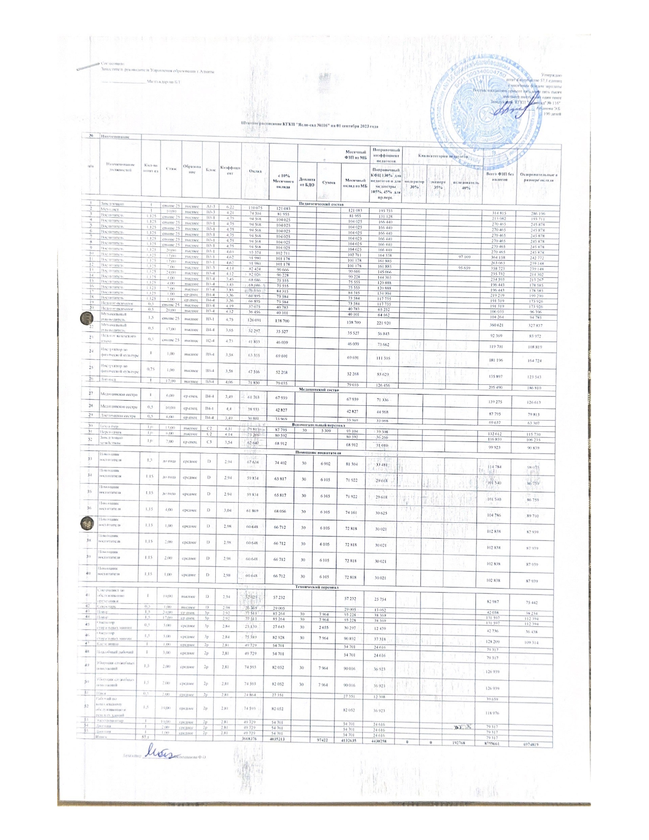 Штатное расписание на 01.09.2023год » КГКП "Ясли сад №116"