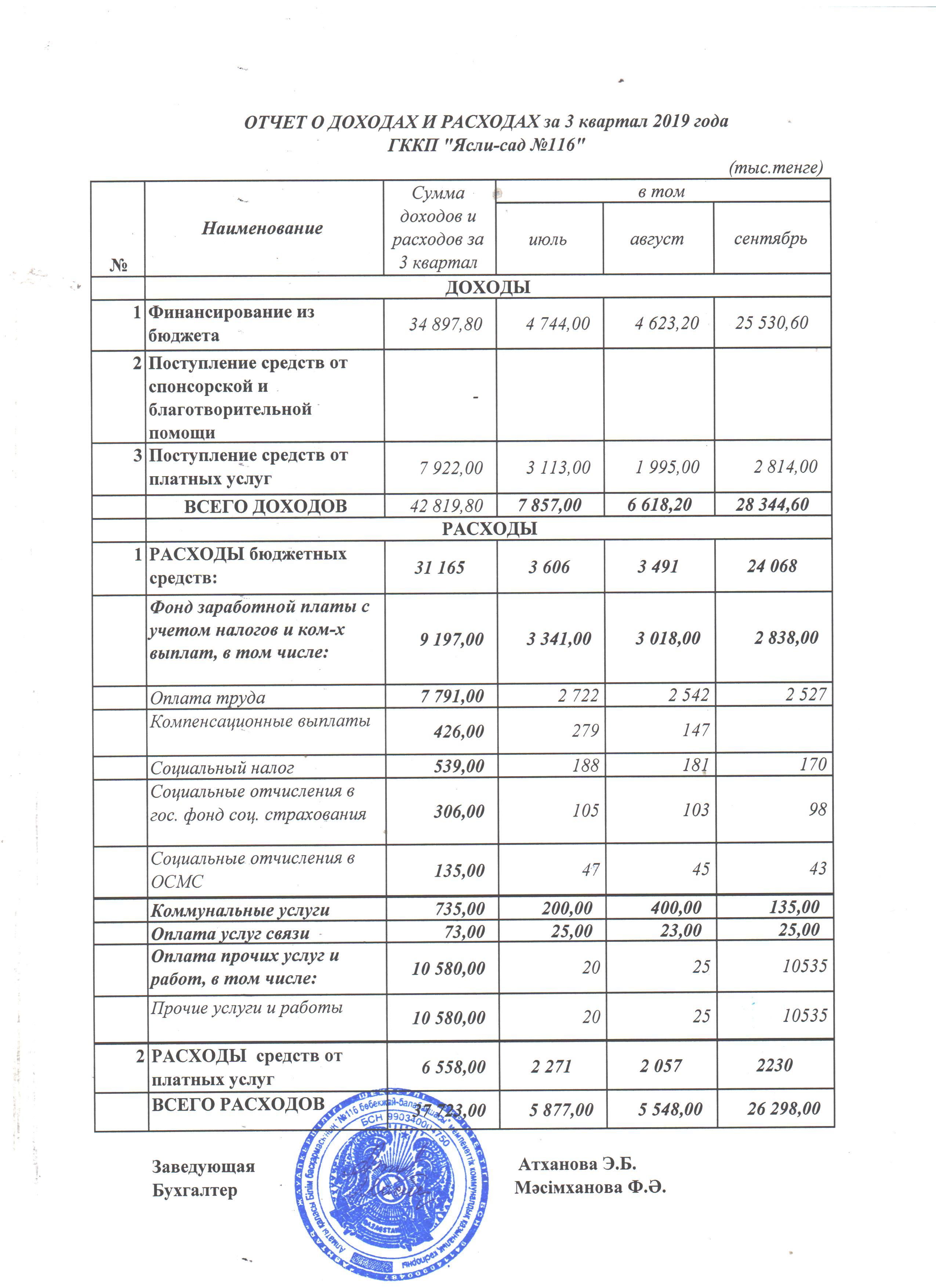 ОТЧЕТ О ДОХОДАХ И РАСХОДАХ за 3 квартал 2019 года » КГКП "Ясли сад №116"