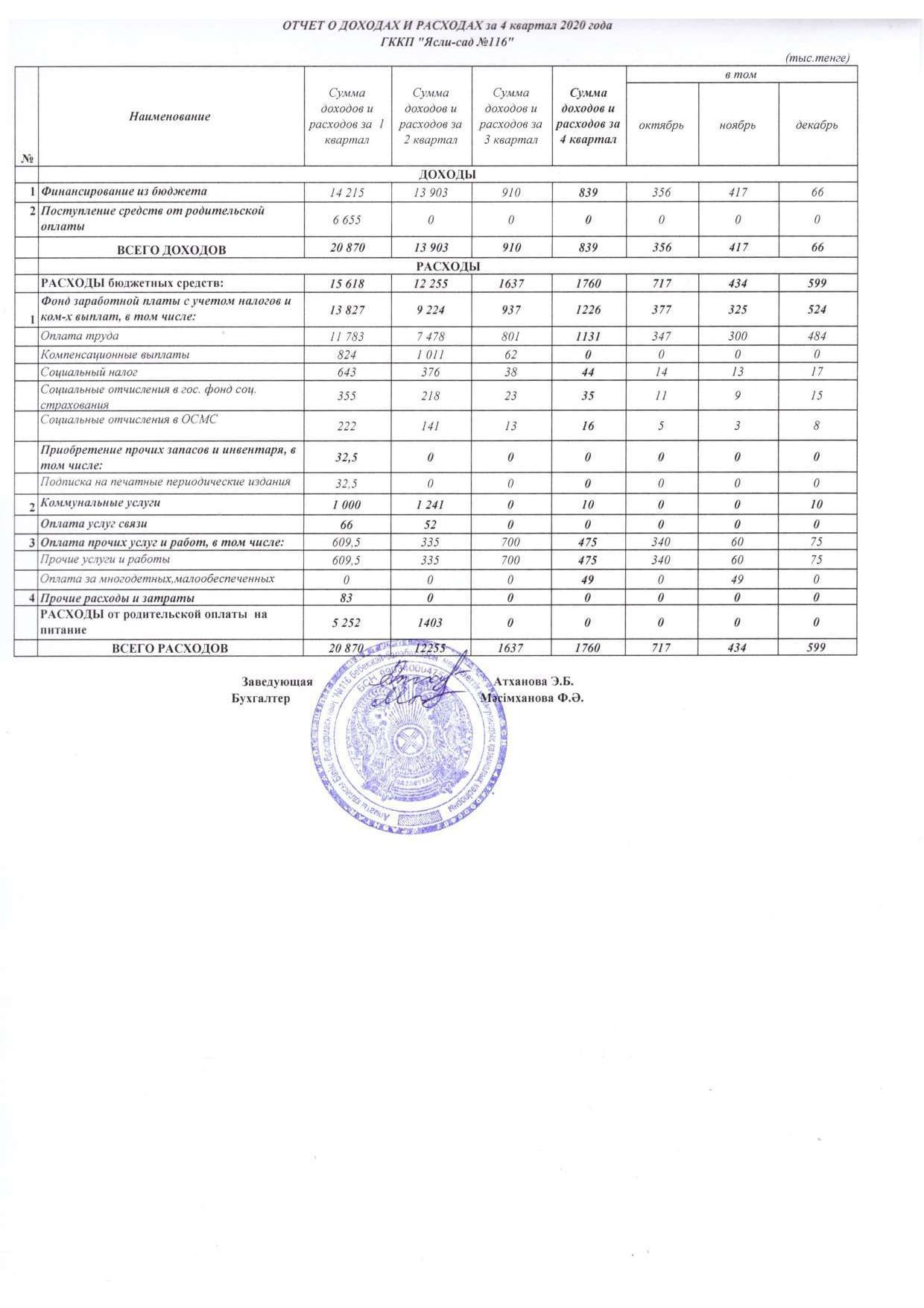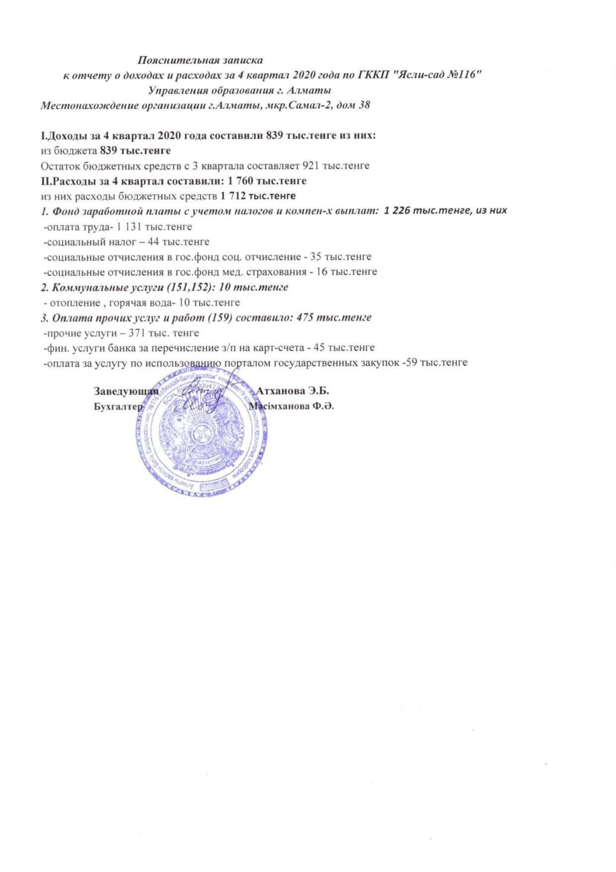 Отчет о доходах и расходах за 4 квартал 2020 года » КГКП "Ясли сад №116"