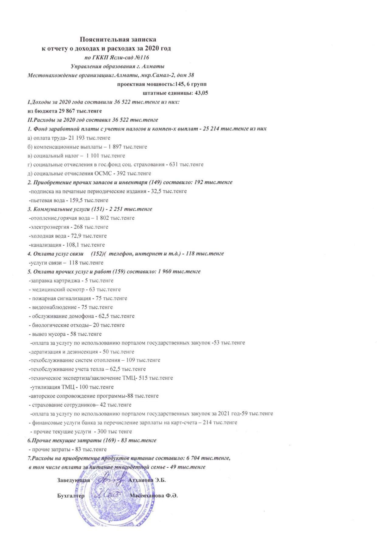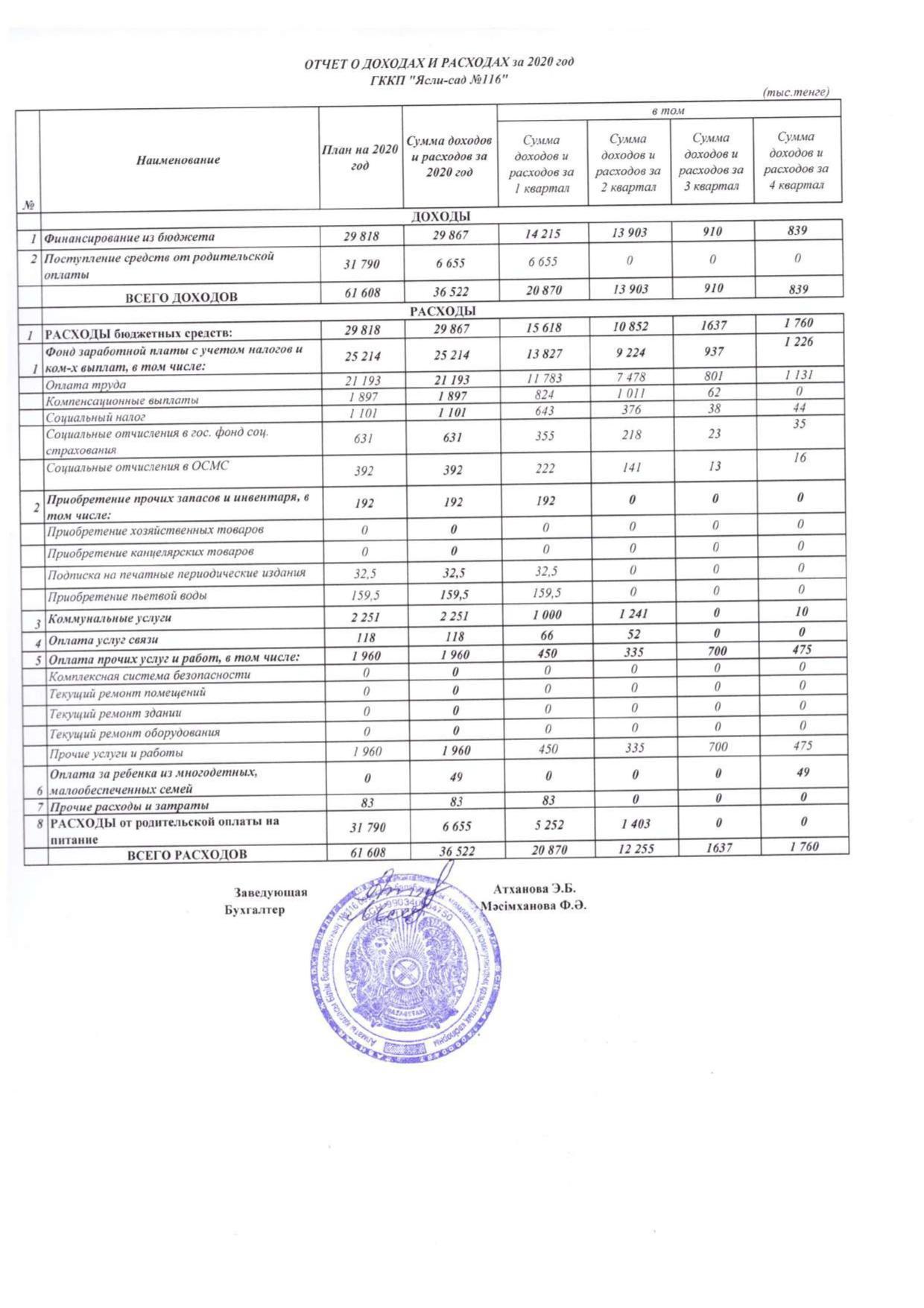 Отчет о доходах и расходах за 2020 год » КГКП "Ясли сад №116"