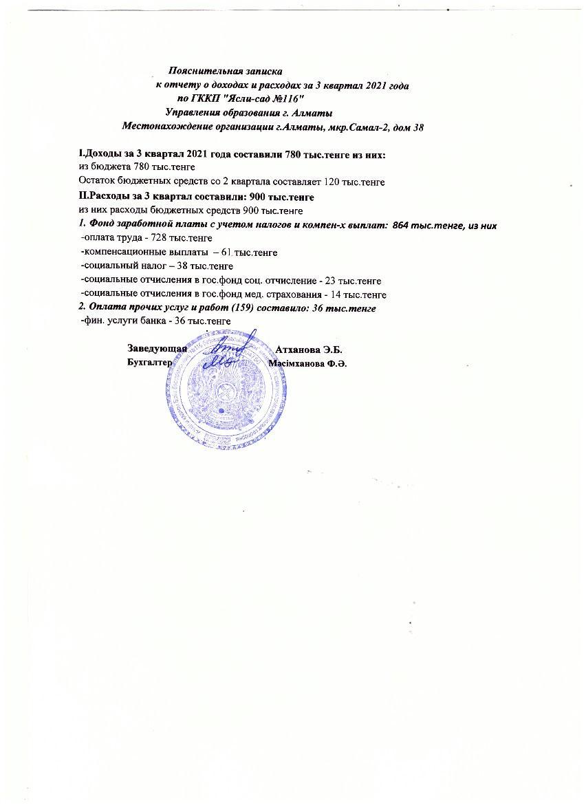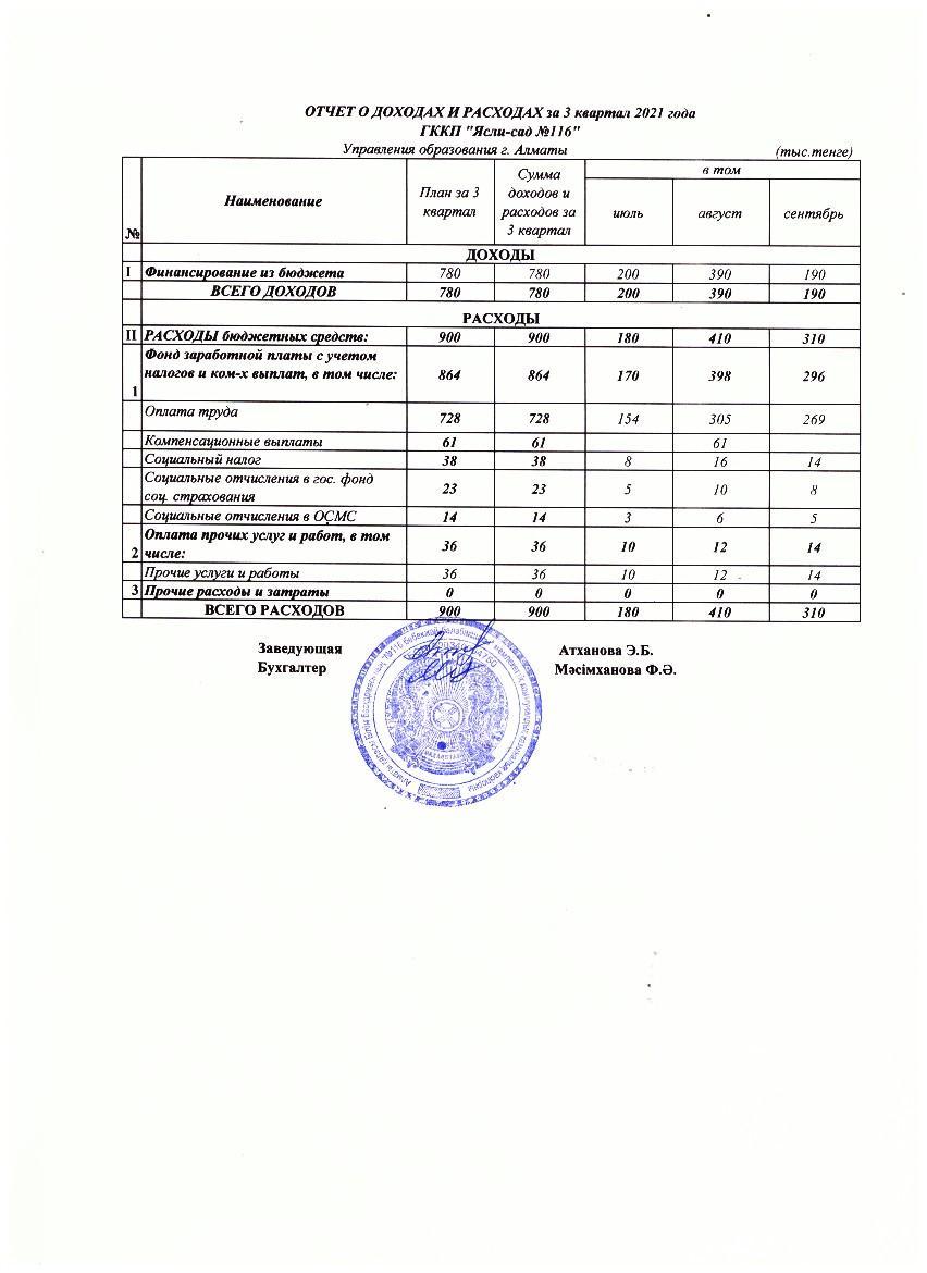 Отчет о доходах и расходах за 3 квартал 2021 года » КГКП "Ясли сад №116"