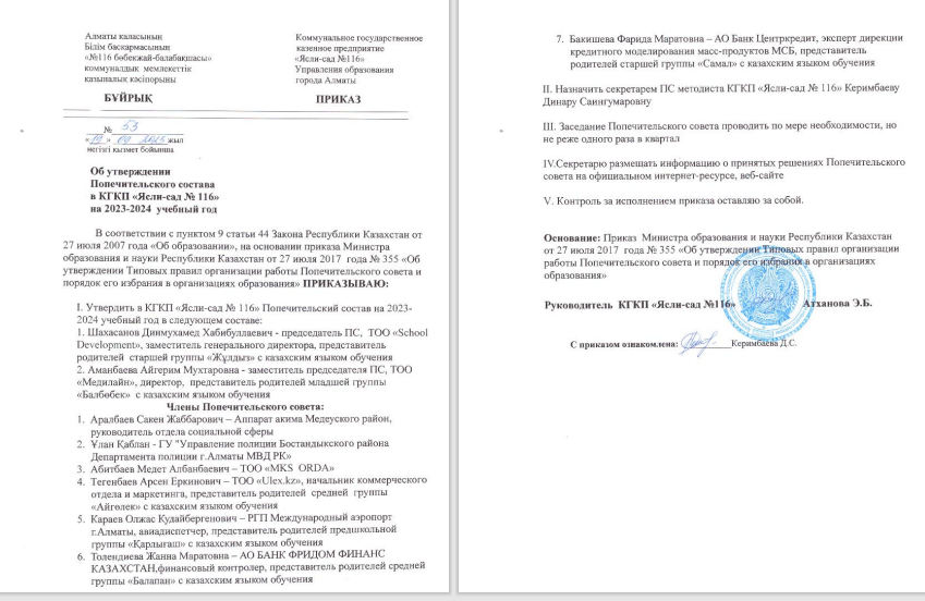 Приказ об утверждении попечительского состава 2023 » КГКП "Ясли сад №116"