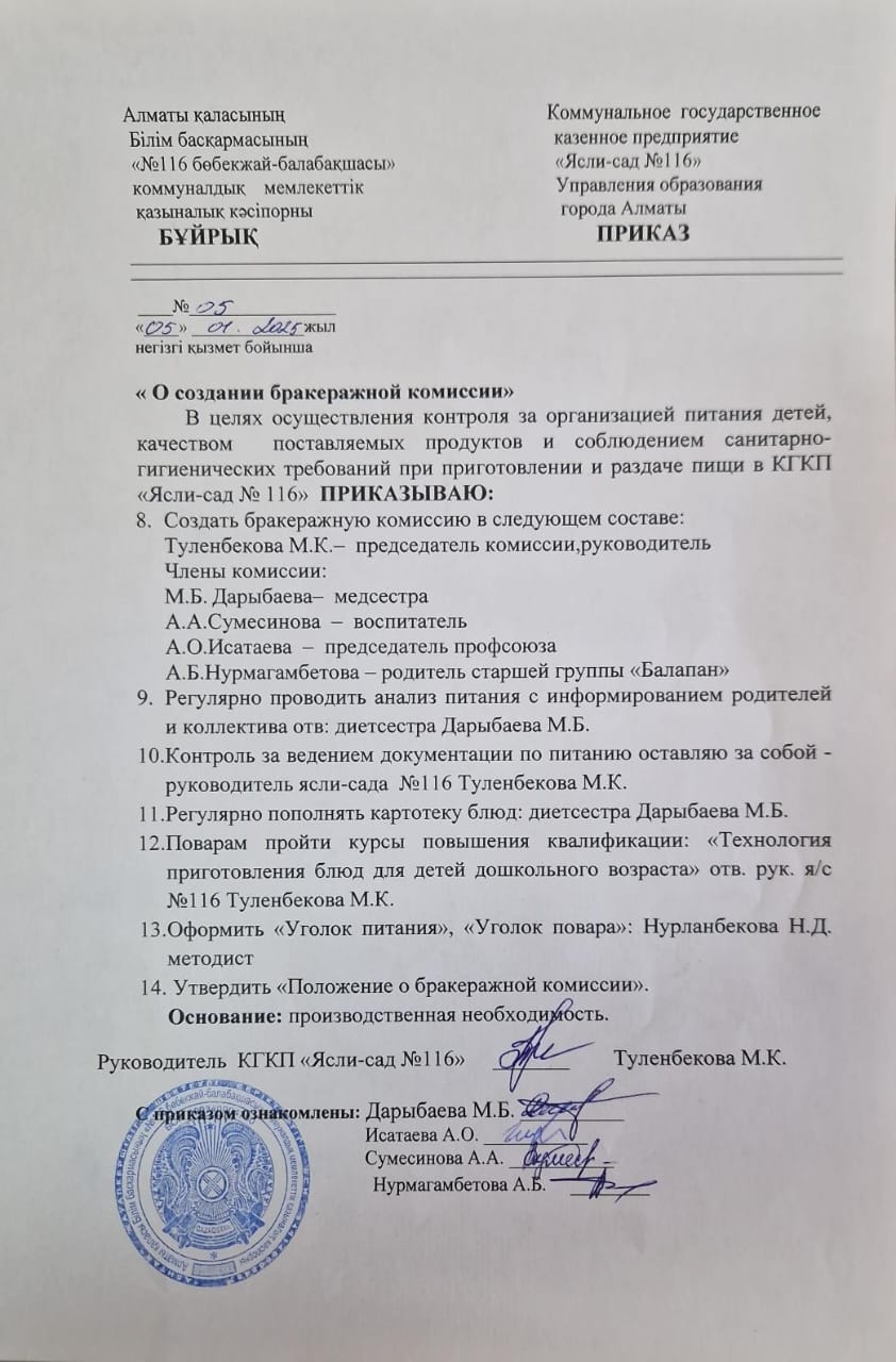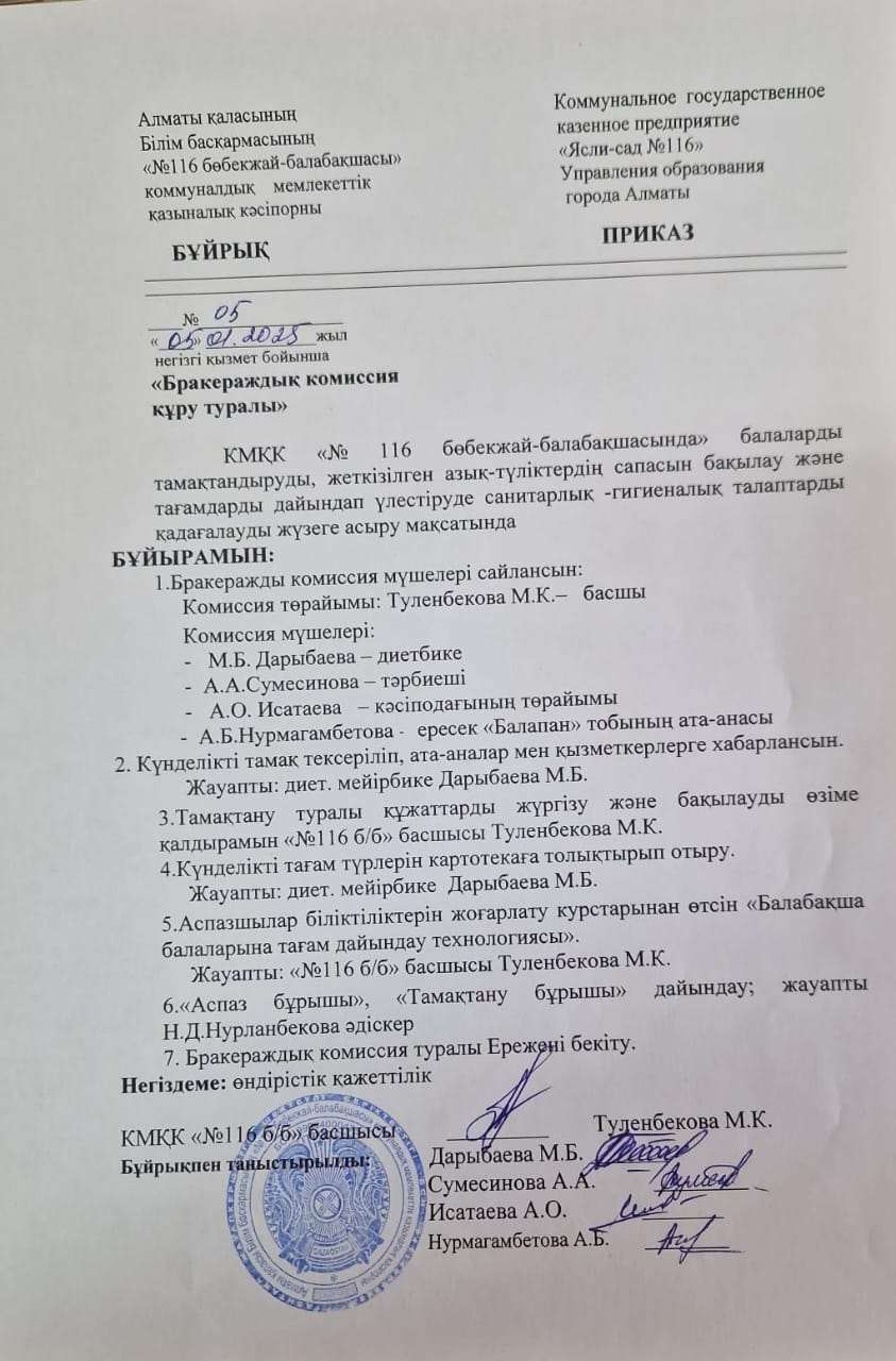 Бракераждық комиссия құру туралы Бұйрық » КГКП "Ясли сад №116"